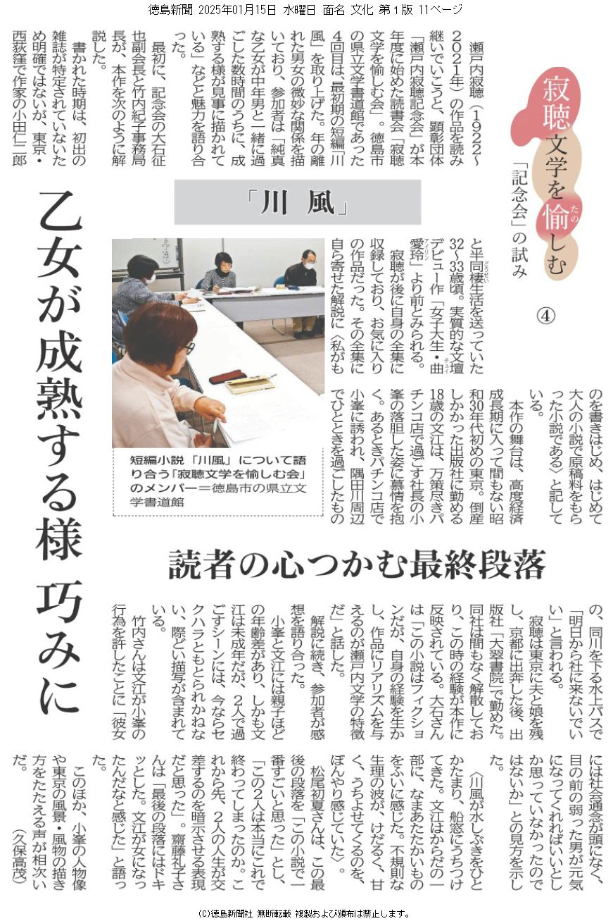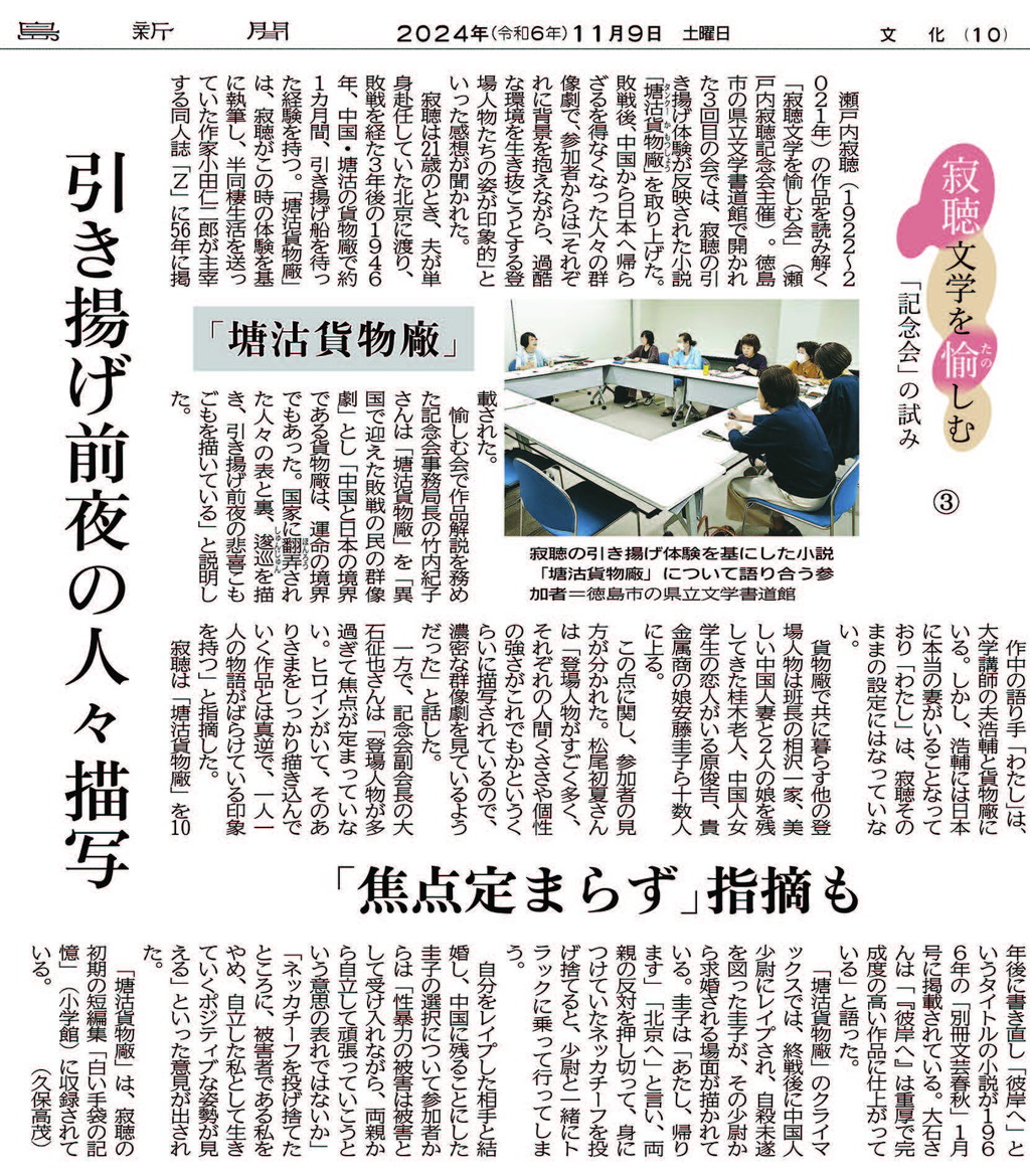 広く寂聴文学を研究し、語り合い、その普及に努めてまいります。多くの方々に親しんでいただき、参加していただければ幸いです。今後とも、ご支援のほど、よろしくお願いいたします。